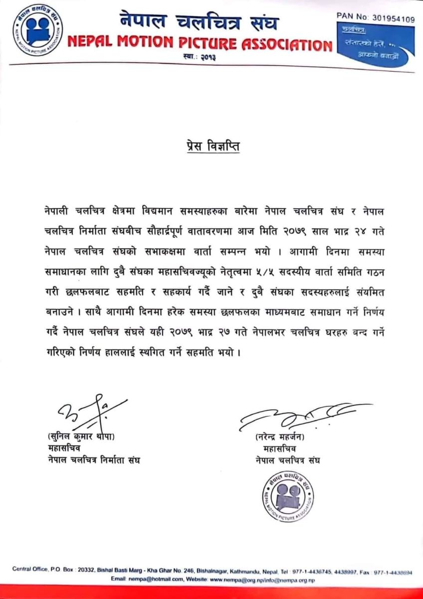 आगामी दिनमा फिल्म क्षेत्रका समस्या समाधानका लागि दुवै संघका महासचिवको नेतृत्वमा ५/५ सदस्यीय वार्ता समिति बनाएर छलफलबाट सहमति र सहकार्य गर्दै अगाडि बढ्ने र दुवै संघका सदस्यहरुलाई संयमित बनाउने निर्णय भएको चलचित्र संघका महासचिव नरेन्द्र महर्जन र निर्माता संघका महासचिव सुनिल कुमार थापाद्वारा संयुक्त रुपमा हस्ताक्षरित विज्ञप्तिमा उल्लेख छ ।