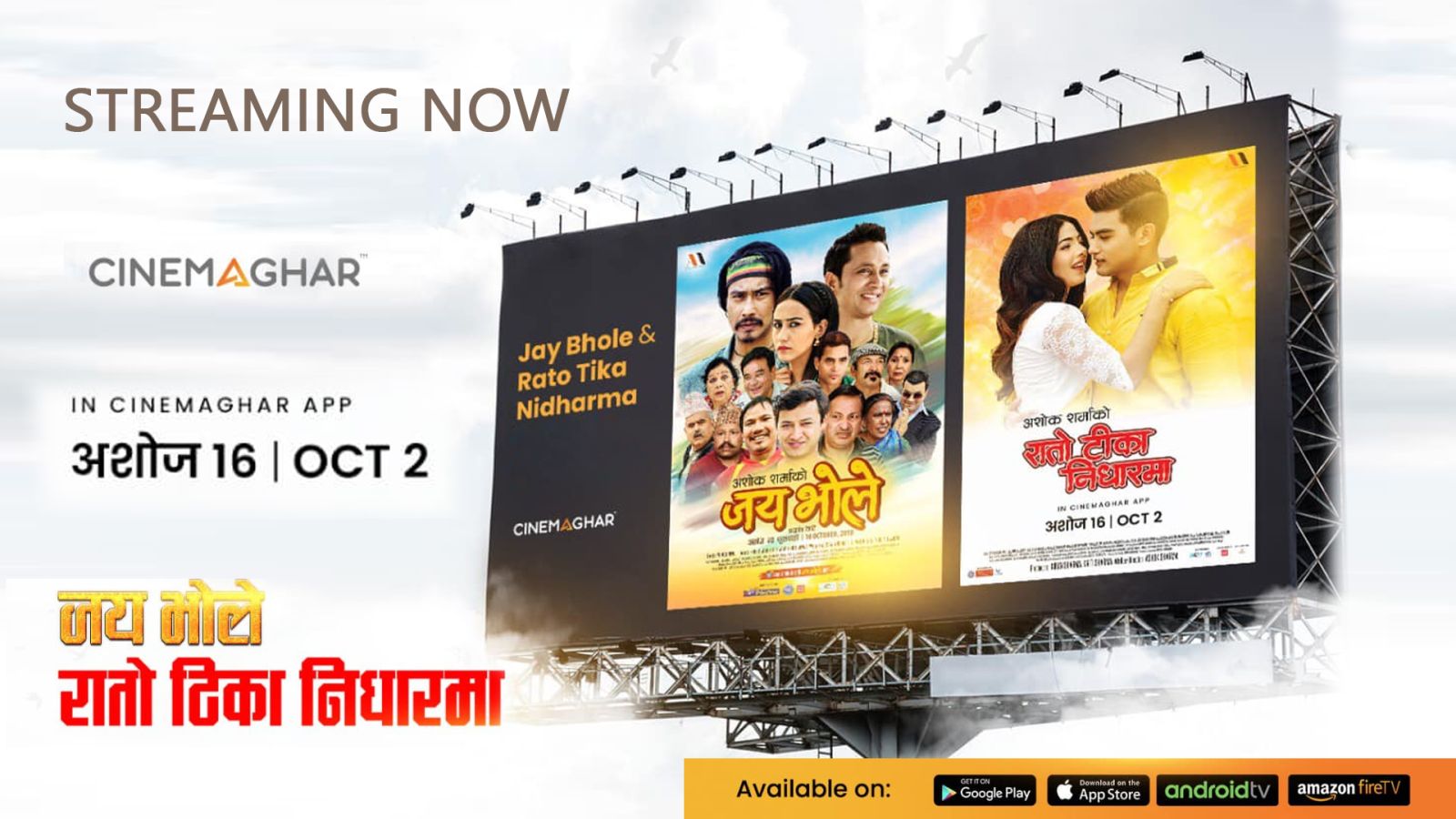 वडा दशैंको अवसर पारेर आइतबार फूलपातीबाट यी दुबै फिल्म ‘सिनेमाघर एप’मा रिलिज भएका छन् । अब दर्शकहरुले यो दुई फिल्मलाई केही सीमित रकम तिरेर दशैंको रमझममा घरमै बसेर हेर्न पाउनेछन् । ‘जय भोले’ २०७५ सालको सफल फिल्म हो भने ‘रातो टीका निधारमा’ २०७६ सालमा प्रदर्शन भएको थियो । यी दुवै फिल्मका निर्माता तथा निर्देशक अशोक शर्मा हुन् ।